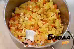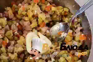 5. Окорок порезать маленькими кубиками. Примешать окорок к остальным продуктам.