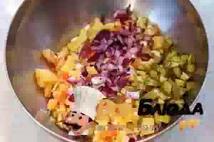 2. Сладкий салатный лук очистить и мелко нарезать. У маринованных или соленых огурцов срезать кончики. Огурцы порезать маленькими кубиками примерно такого же размера, что и остальные овощи.