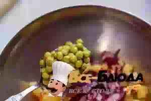 4. С банки зеленого горошка слить жидкость. Переложить горошек в миску к остальным продуктам.