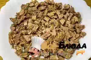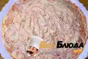 1. В подсоленной воде отвариваем говядину (свинину или любое другое мясо) и остужаем, не вынимая из бульона. Нарезаем мясо мелкими кубиками, выкладываем ровным слоем на плоскую тарелку, на который планируете подавать салат на стол.