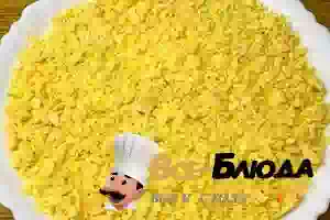 3. Отвариваем яйца, чистим от кожуры и отделяем желток от белка. Измельчаем желтки, укладываем следующим слоем.
