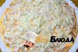 2. Измельчаем отварной картофель на крупной терке и покрываем им мясо. Солим и смазываем майонезом.