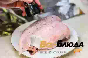 2. На мой вкус, куриную грудку для оливье лучше не отваривать, а запекать. Целую куриную грудку с кожей, на кости промыть под холодной проточной водой, обсушить бумажным полотенцем, затем натереть солью, молотым черным перцем и слегка смазать растительным маслом. Завернуть мясо в фольгу и убрать в прогретую до 180С духовку. Проверить готовность куриной грудки через 40 минут. Запеченную куриную грудку, не разворачивая фольгу, переложить на блюдо, чтобы она полностью остыла.