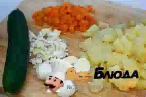4. Яйца и очищенные вареные овощи порезать кубиками примерно одного размера.