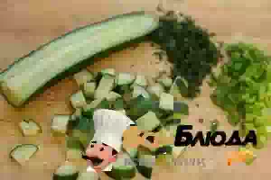 6. Репчатый лук очистить и мелко нарезать. У свежего огурца срезать кожицу, если она слишком плотная. Огурец порезать маленькими кубиками примерно такого же размера, что и остальные овощи. Свежую зелень промыть под проточной водой, обсушить на бумажных полотенцах и мелко порубить. Сложить в посуду подходящего размера овощи, яйца, мясо, зеленый горошек, лук, свежую зелень и приправить по вкусу солью и молотым черным перцем.