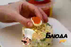 7. Добавить в оливье майонез и перемешать. С помощью кольцо для салата выложить оливье на тарелку. Для украшения взять отложенное перепелиное яйцо, разрезать пополам и удалить из яичных половинок желток. Желток раскрошить, посыпать им салат. Половинки белка наполнить красной икрой и положить на горку салата. Оливье с курицей и свежим огурцом готов к подаче.