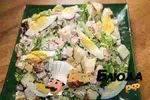 6. Из майонеза и горчицы сделать заправку. Прибавить к салату, посыпать обжаренными сухариками и перемешать. По желанию дополнительно посолить. Переложить салат Цезарь с ветчиной на сервировочное блюдо и украсить нарезанным на дольки яйцом. По желанию можно добавить томаты черри.