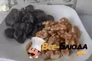1. Первым делом - замариновать куриную грудку. Так она будет мягче и вкуснее в салате. Для этого надо залить куриное филе соевым соусом, по желанию добавить любую приправу: базилик, паприку, тимьян или готовую смесь для курицы. Оставить мясо в маринаде на 30 минут. Подготовить остальные продукты для салата: промыть чернослив, обжарить грецкие орехи.