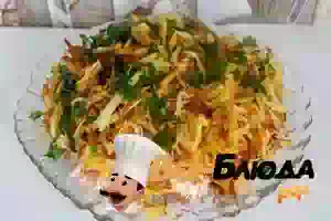 1. Очищенный сырой картофель натереть на специальной терке для салатов по-корейски. Затем несколько раз промыть под проточной холодной водой, чтобы максимально смыть с него крахмал. Полотенцем подсушить промытый картофель. На раскаленном растительном масле поджарить картошку до появления хрустящей золотистой корочки.