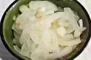3. Лук нарезаем полукольцами. Заливаем маринадом, для которого смешиваем кипячёную холодную воду, сахар, соль и уксус. Всё делаем по вкусу. Смешиваем вареную говядину, огурцы и отжатый от маринада лук. Затем добавляем томатный соус (в классическом рецепте будет томатная паста), растительное масло и приправляем молотым чёрным перцем. Мясной салат по-берлински готов.