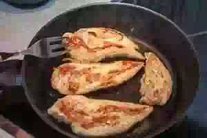3. Разогреть сковороду и обжарить филе куриной грудки с двух сторон до полной готовности. Масло в сковороду можно не добавлять, будет достаточно того жира, который добавили при мариновании. Жареную курицу переложить на лист фольги, завернуть и оставить в таком виде остывать.