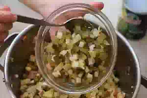 8. У соленых или маринованных огурцов срезать кончики. Остальную часть огурца нарезать кубиками. Репчатый лук мелко порубить. Вместо репчатого можно взять зеленый лук.