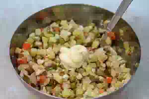 12. Заправить салат майонезом, перемешать. Оливье с жареной курицей готов.