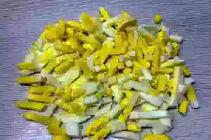 2. Вкрутую отваренные яйца чистим, крошим мелкими брусочками.