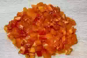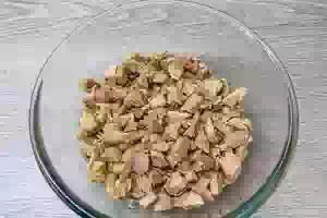 4. Отварное мясо кролика к этому времени уже остынет. Нарезаем его средними кусочками.