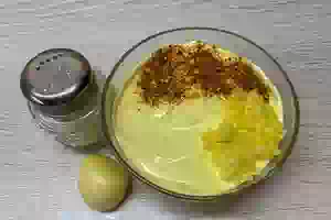 5. Переходим к заправке. В миску вливаем майонез, кладем измельченные зубчики чеснока, щепотку соли и смесь перцев. Тщательно перемешиваем до однородности.