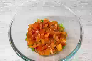 8. Закрываем слой помидоров салатным луком. Наносим слой майонезной заправки.