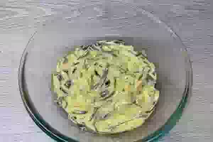11. Распределяем на яйца оставшуюся часть листьев салата. Повторяем майонезный слой заправки.