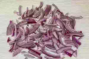 1. Заранее отвариваем в подсоленной воде мясо кролика. На это уйдет примерно 30 минут после закипания воды. Отдельно сварим яйца (10 минут после закипания). Сладкий салатный лук шинкуем тоненькой соломкой. Листья зеленого салата споласкиваем, обсушиваем на бумажном полотенце, нарезаем средней соломкой или мелко рвем руками.