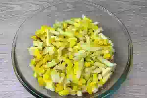 2. Вкрутую отваренные яйца чистим, крошим мелкими брусочками.