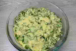 11. Распределяем на яйца оставшуюся часть листьев салата. Повторяем майонезный слой заправки.