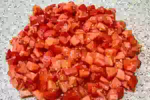 3. Для салата берем плотные помидоры, т.к. они пустят меньше сока и не испортят внешний вид готового блюда. Моем их под проточной водой, подсушиваем на тканевой салфетке и нарезаем средними кусочками.