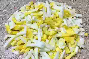 4. Отвариваем вкрутую яйца. Чтобы легче было очистить скорлупу, сразу помещаем яйца на несколько минут в холодную воду. Очищенные яйца рубим кусочками.