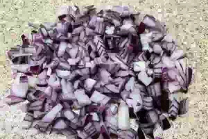 5. Острым ножом мелко шинкуем сладкий лук.