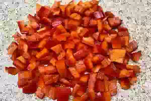 7. Сладкий перец споласкиваем, освобождаем от семян и крошим маленькими ломтиками.