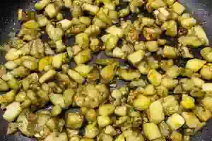 8. Срезаем с баклажана кожуру. Очищенный баклажан, нарезаем кубиками и немного солим. Оставляем на 10 минут. Затем обжариваем на сковороде в масле до готовности.