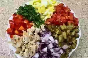 9. В глубокую тарелку отправляем все подготовленные ингредиенты: болгарский перец, филе кролика, салатный лук, остывшие жареные баклажаны, помидоры, яйца и зелень.