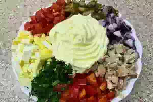 10. Добавляем майонезную заправку. Перед тем, как подать салат на стол, аккуратно соединяем все ингредиенты. По своему вкусу добавляем перец и соль. По желанию украшаем ломтиками перца и листочками петрушки. Мясной салат из кролика с жареными баклажанами готов.