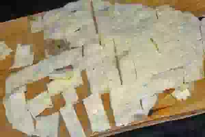 3. Готовый омлет переложить на тарелку, дать ему остыть, а затем нарезать небольшими кусочками. Салат из пекинской капусты с крабовыми палочками, кукурузой и омлетом , Шаг 03 Пекинскую капусту сполоснуть под проточной холодной водой, обсушить на бумажных полотенцах и нарезать соломкой. Нарезанную капусту посолить и слегка помять руками.