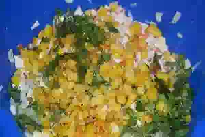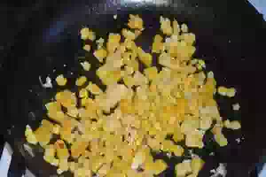 4. Кукурузу обжарить на растительном масле, время от времени помешивая, около 2-3 минут. Если замороженной кукурузы не оказалось в холодильнике, замените её консервированной.