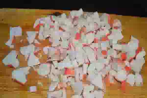 Салат из пекинской капусты с крабовыми палочками, кукурузой и омлетом