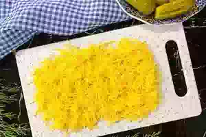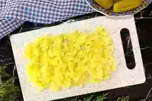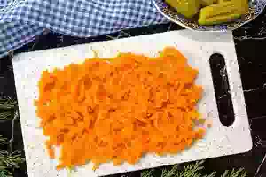 3. Измельчаем на средней терке вареную морковь. Чистим лук от шелухи, мелко рубим. Вареные яйца чистим и пропускаем через мелкую терку.