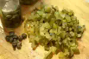 4. огурцы. У маринованных (или соленых) огурцов предварительно срезать кончики. Репчатый лук очистить и мелко нарезать. Каперсы мелко порубить.