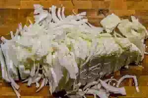 2. Остальную часть капусту тонко порезать, причем, чем ближе к кочерыжке, тем тоньше.