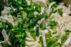 3. Зеленый лук и укроп мелко порубить, добавить в салатник к капусте.
