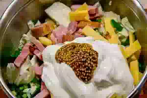 5. Салат посолить, заправить сметаной и горчицей, перемешать и все - салат из пекинской капусты с колбасой и сыром готов.