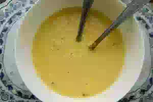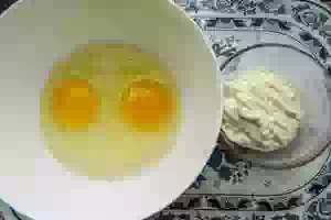 1. Для приготовления салата с омлетиками и сухариками в глубокой миске взбить венчиком яйца, смешать их с двумя ложками майонеза, добавить немного соли и перца.