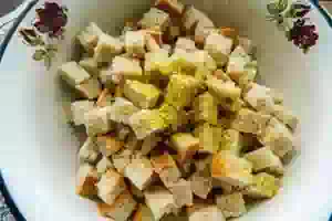 Чтобы приготовить сухарики, хлеб или батон нарезать кубиками. Перемешать кубики хлеба с солью и специями, обжарить на сухой сковороде до золотистой корочки или же подсушить сухарики в духовке.