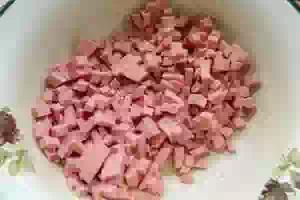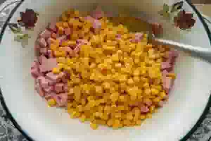 6. В миске смешать колбасу с консервированной кукурузой, слив с неё предварительно жидкость.