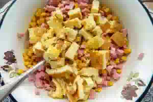 6. В миске смешать колбасу с консервированной кукурузой, слив с неё предварительно жидкость.