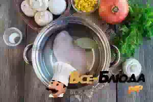 1. Куриное филе помоем, зачистим от пленочек и зальем холодной водой. Чтобы сохранить сочность, будем варить мясо целым куском. Перед закипанием воды обязательно снимем пену. Когда бульон начнет бурлить, уменьшим мощность плиты и добавим лаврушку. Проварим филе 20 минут, затем полностью остудим.