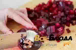 1. Свеклу вымыть, обернуть фольгой и запекать в прогретой до 200С духовке около 30 минут, пока свекла не будет готова. Не снимая фольги, переложить её на тарелку и дать полностью остыть. Запеченную свеклу очистить, порезать мелкими кубиками и переложить в салатник.