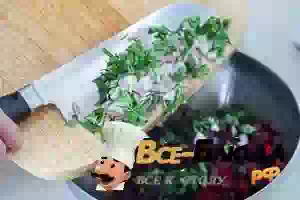 3. Свежую зелень и лук мелко порубить переложить в салатник. Туда же отправить семена тмина.