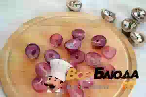 1. Виноград хорошенько промываем и каждую ягодку разрезаем на 2 половинки. Грецкие орехи очищаем и измельчаем. Для этого можно воспользоваться ступкой или измельчителем.