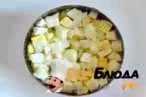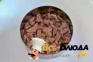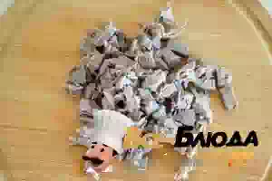 2. Мякоть говядины отвариваем в небольшом количестве подсоленной воды или на пару. Даем говядине остыть и нарезаем на маленькие брусочки или кубики.