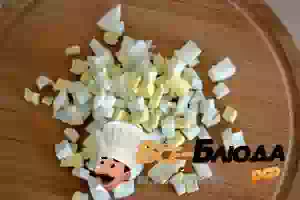 3. Отварные яйца очищаем и нарезаем на мелкие кубики. Сыр натираем на мелкой или средней терке.